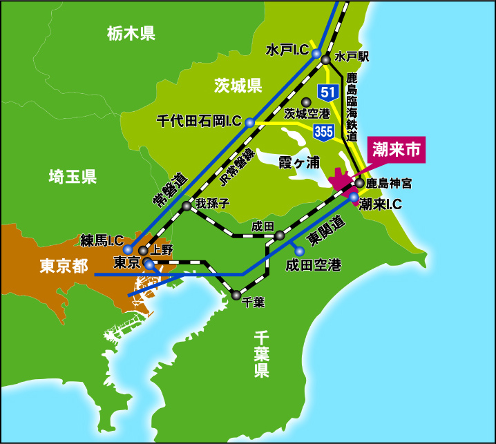 「潮来」は「いたこ」と読みます。東京からは、車で約80分です。