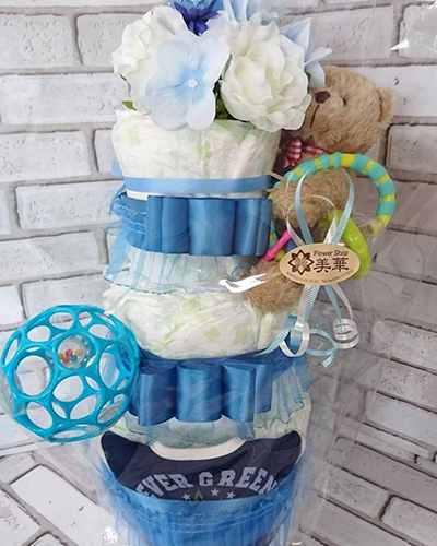 もらった人は喜ぶこと間違いなしの紙おみつが包まれているアレンジメント(出産祝いのおむつケーキ)。