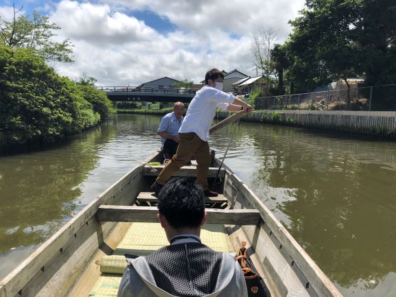 キーマン取材→酒蔵見学(愛友酒造)→道の駅いたこ→ろ舟遊覧(船頭体験)→あやめ笠づくり体験