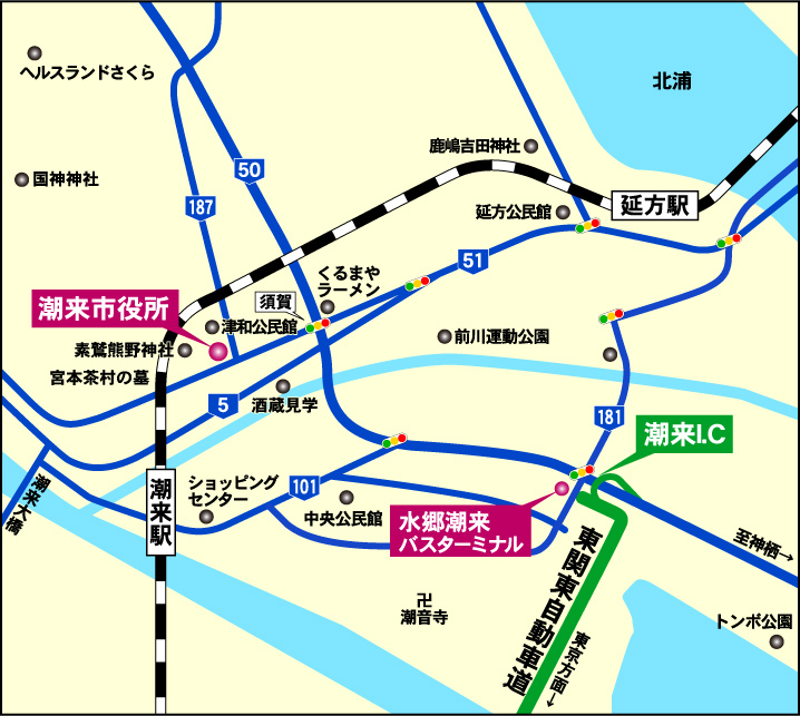 ホームスタジアムである県立カシマサッカースタジアムへは、潮来市役所より車で15分程(約10km)と近く、アクセスしやすくなっています。